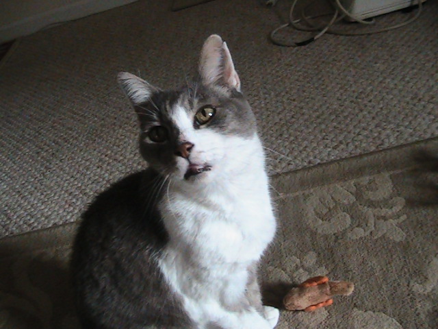 This is my favorite cat of my good freinds, Simon, Simon is the sweetest gentle male and wouldn't hurt a flea, he is somewhere in the neighborhood of nineteen years old, nobody seems to know his exact birthdate. The people who owned him for 17 years were ready to abandon him after their landlord said they had to either move or get rid of him. >:(How could you just throw an animal away after all those years? He just recently had a viral infection and he got pretty sick, but for a cat who has eaten a diet of plain old Dry Cat food, FRiskies, he is pretty darn healthy. He also has a short tail, ( amputated from getting run over by a car) and has extra toes on his paws , seven on each foot.