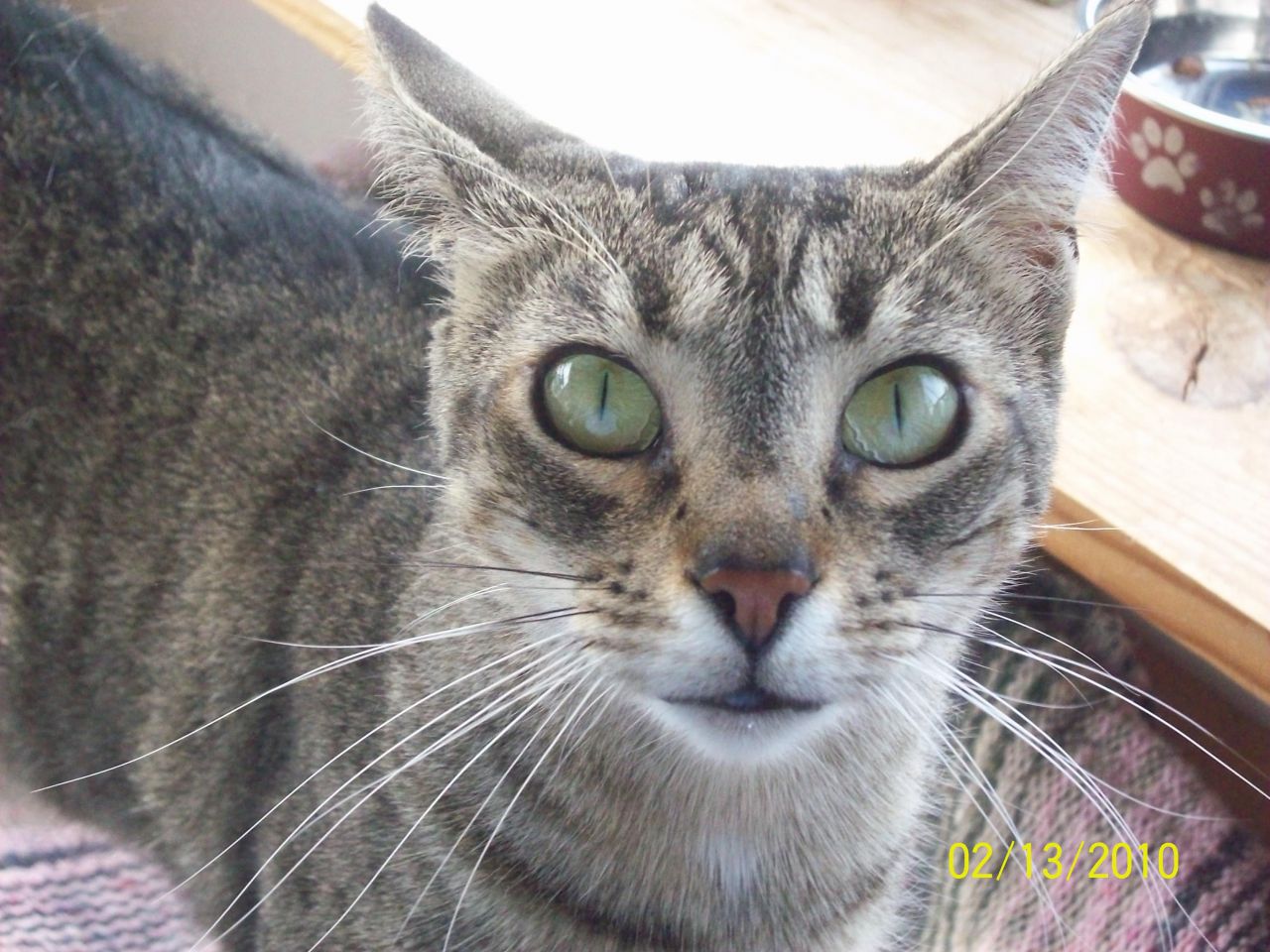 This is our youngest little cat, Suzzette, or as I refer to her, Suzy Q. she has big eyes, a short tail and loves to wash everyone and I mean everyone in the house. She used to mother Little Paco, my black and white Tuxedo little boy who had FIP, which is a fatal feline disease, When she sniffs you, she will begin to wash you and wash you and wash you and eventually you have to take your hand away, because it tickles so much having her wash and lick you with that tongue of hers. She is a very petitie loving cat and very pretty! She loves the biggest cat and Male in our house, Dinta, the big orange and white Turkish Van.