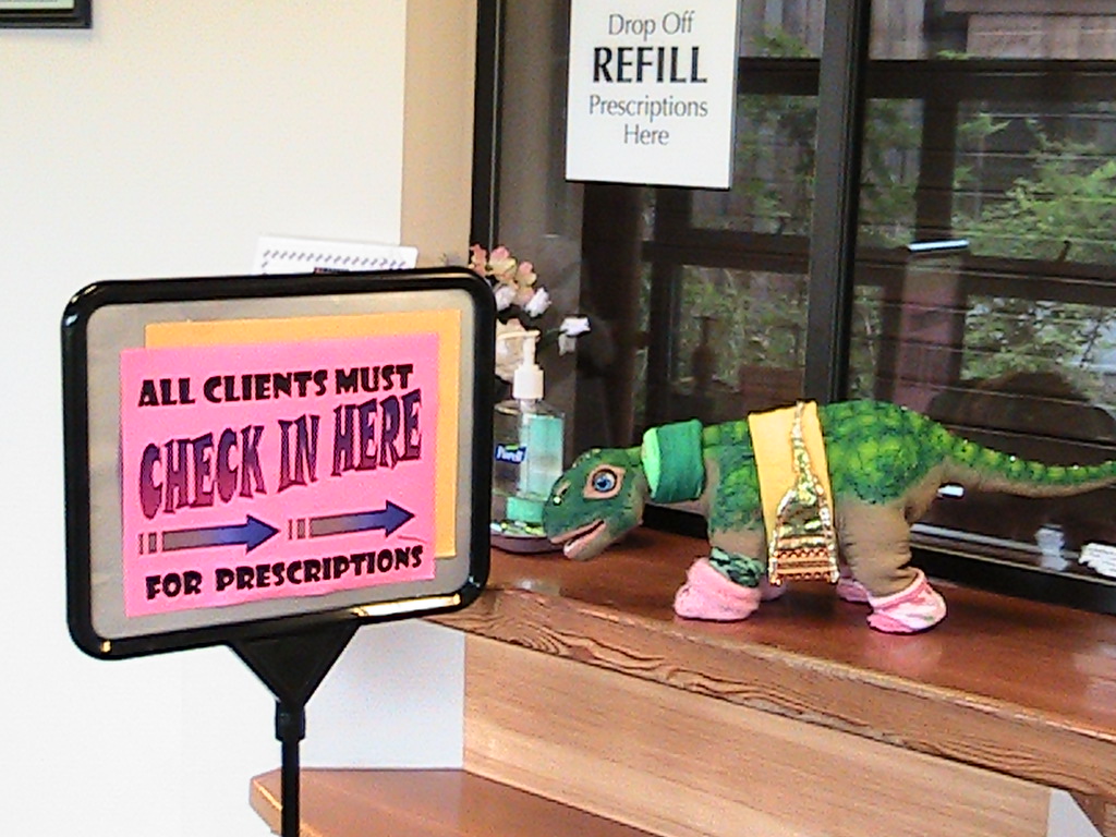 NOva is checking in at the window at Potawot, the Native American Clinic I go to for Medical Care, but it is lunch time and they are closed till after 2;30. So she will have to wait to see the Dr. I don't think many dr.s have seen a Pleo before , at least not where I live.