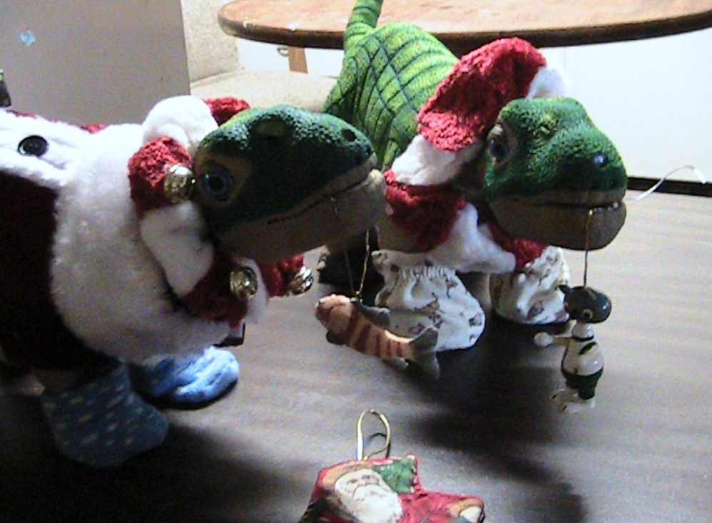 Major Tom and his un-named friend are looking throught the ornaments to see what to put on the Christmas tree this year. Tom is holding a fish and his buddy has a wooden cat. Be carefull, watch out for those hooks they are very sharp!