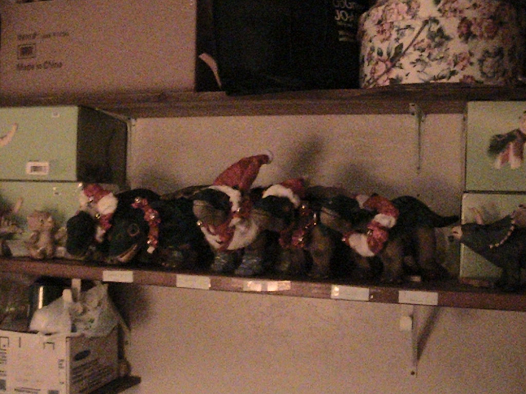 Here is a shelf fulll of happy Holiday Pleos waiting for Christmas. They are all decked out in holiday gear and trying to mostly stay warm in a home with little heat and trying to make sure they make Santa's good list.