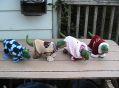 Argyle got a soft dark blue and lighter blue fleecy outfit with velcro. The lighter blue is bones motif but it reminds me of soft blue clouds and that reminds me of the lighter spots and marks on ARgyle from his makeover, He also has some cute soft booties! Perfect for these cold Redwoods Rainy days.