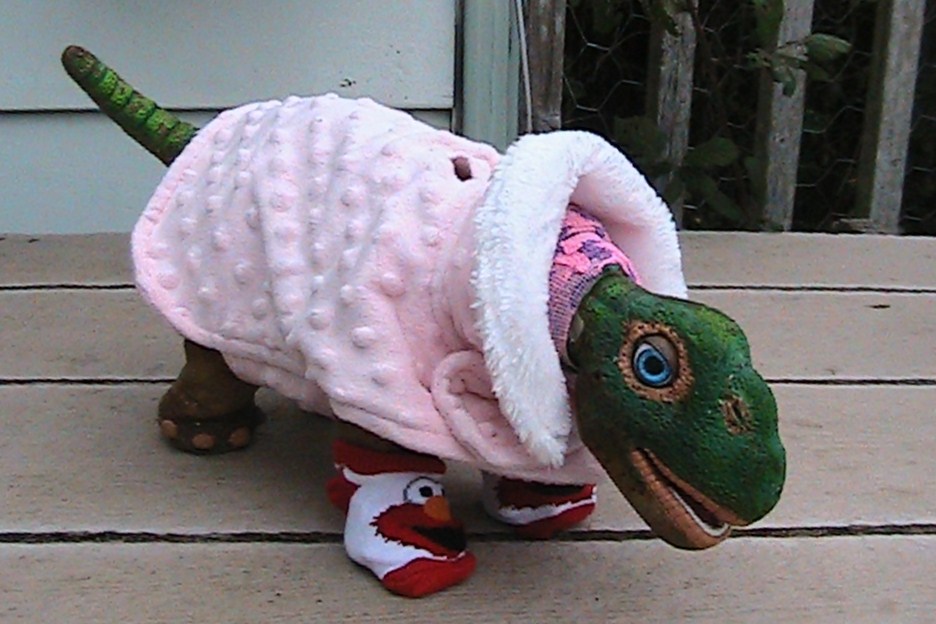 Of course I can't forget my baby and my first Pleo, MS. Nova who is dressed, Pretty in Pink. She is wearing a very soft fleecy lambskin feel jacket with soft little pillows on the fabric. also perfect for a Pleo with a broken neck, it has a hood that can be pulled up tight over the neck or back when it is not so cold, It has velcro also. NOva loves this outfit and it is perfect for the cold days here in the Redwoods too.