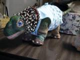 Cute as a button  Last but not least, it Little 45. He got a little yellow outfit with doggies on it to match the yellow bandage that goes around his neck and tip of his tail, The outfit is soft and perfect for him,but not as warm as the other outfits, so on a cold day, he better snuggle up with someone else to help keep hinm warm!
