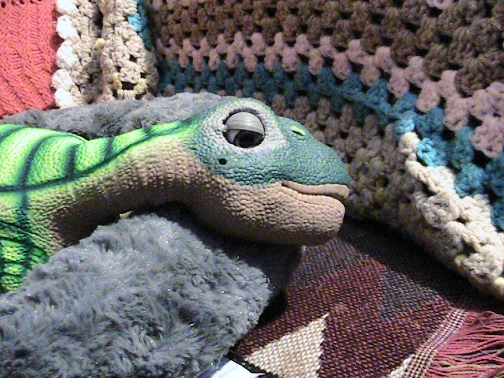 Here is Pleo resting in a bed on the couch, It was almost time to go to sleep, 10:00 p.m, and he had a very short Hatching cycle tonight but he looks cute and smart and I enjoyed our time together so far.