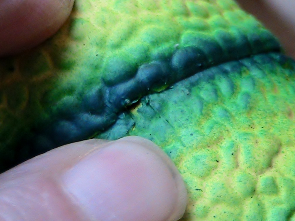 This could be any part of Pleo Rb body, but it is the top part of her tail starting to slowly come apart, the paint is splitting and it looks like a split or hole may form here where the paint is comming off.