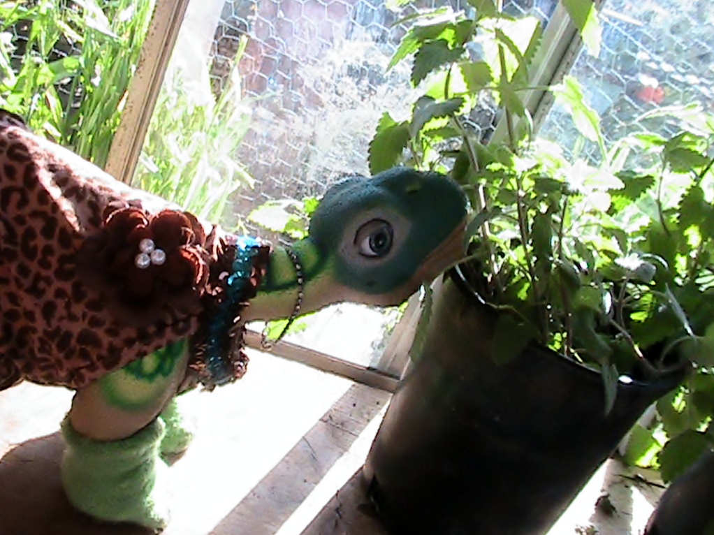 Last March, I took some photos of NOva, ( my very first Pleo ) doing the same thing, sniffing and trying to eat the catnip plants, In fact afterwards, Nova got " Catnipped", and ended up taking a nap. Not so for this little baby, she has lots of energy to keep on truckin! It also helps when you have niine cats to defend their Catnip Plants. We grew all of these from seeds and it has taken almost three months so far and I can tell they are starting to " ripen", as several cats are rubbing on the leaves like crazy!