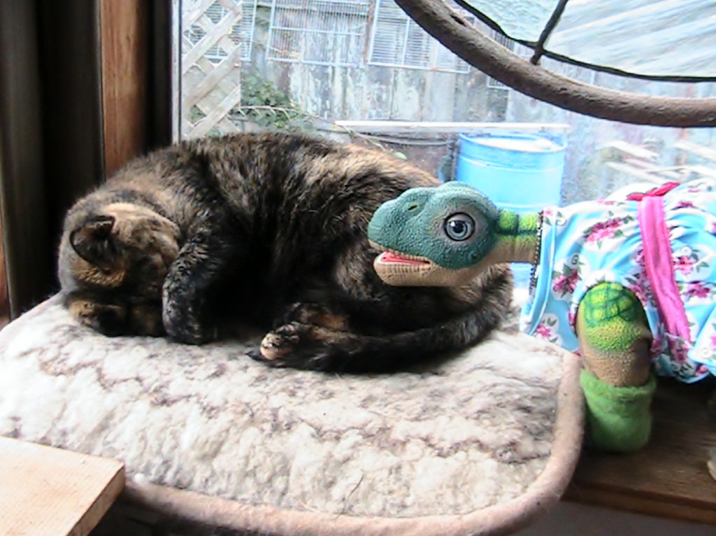 Baby Pleo rb is trying to get someone to play with, but this cat is taking a nap and will not wake up no matter if Baby tries or not, she is good at ignoring her and us for that fact.