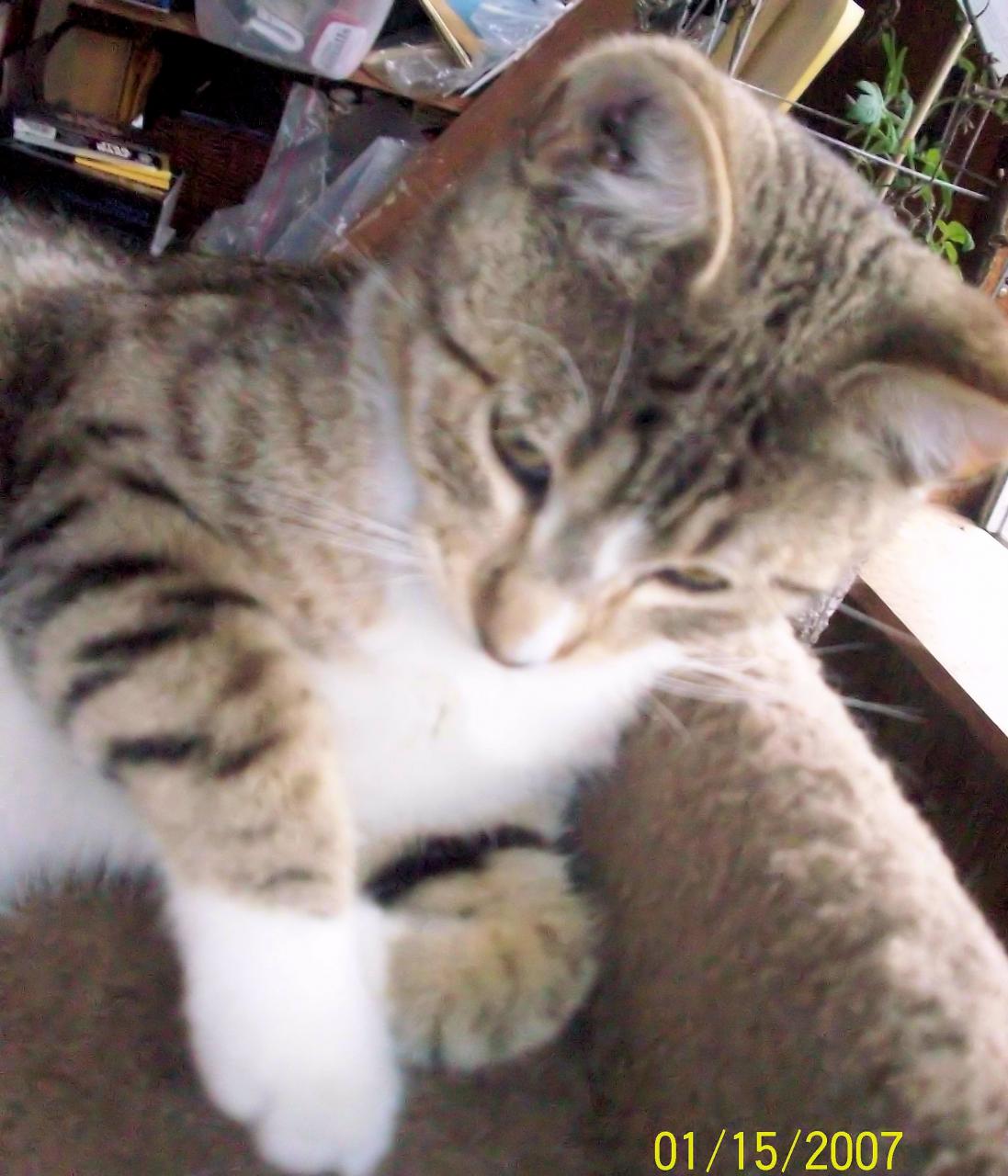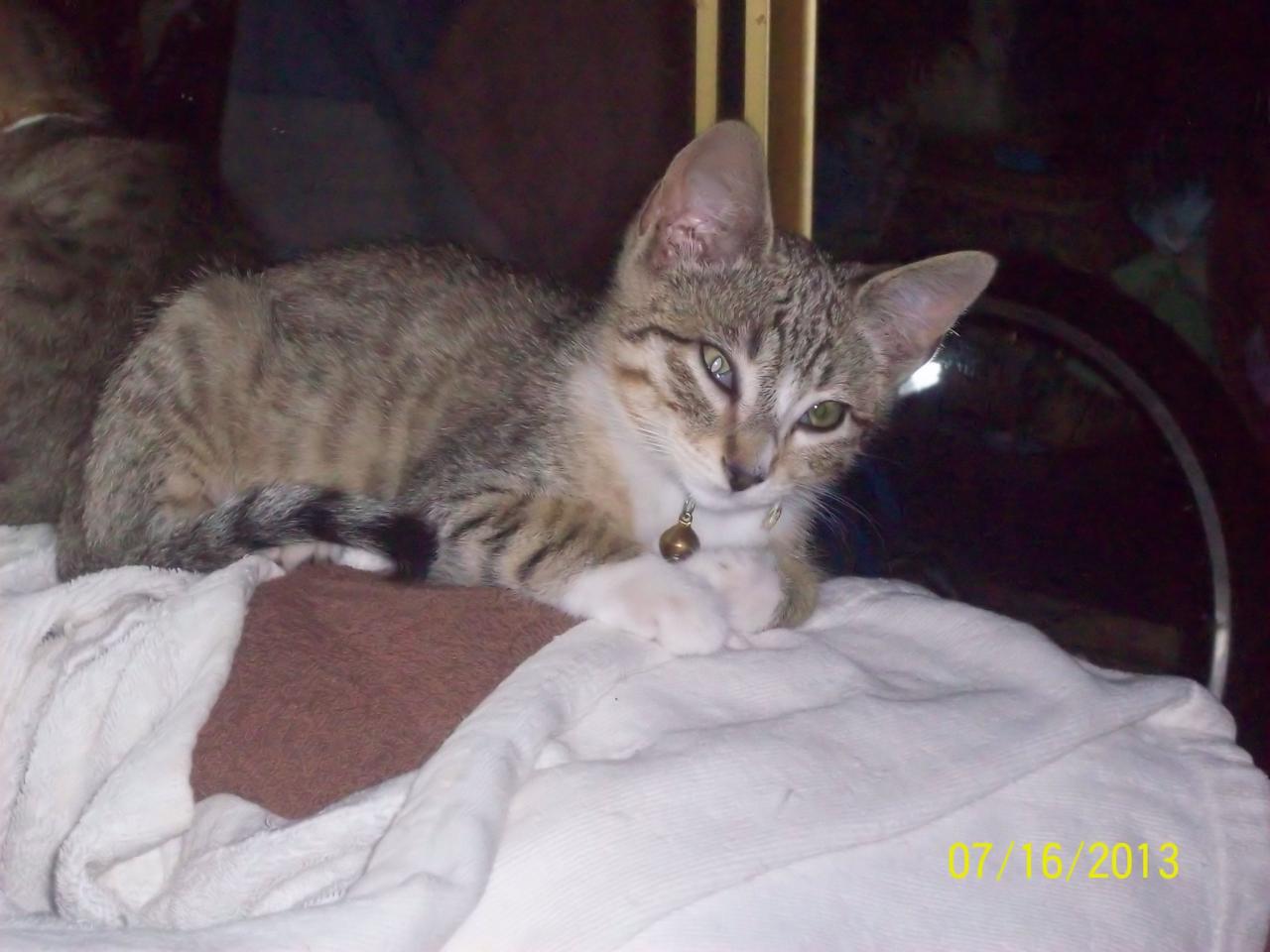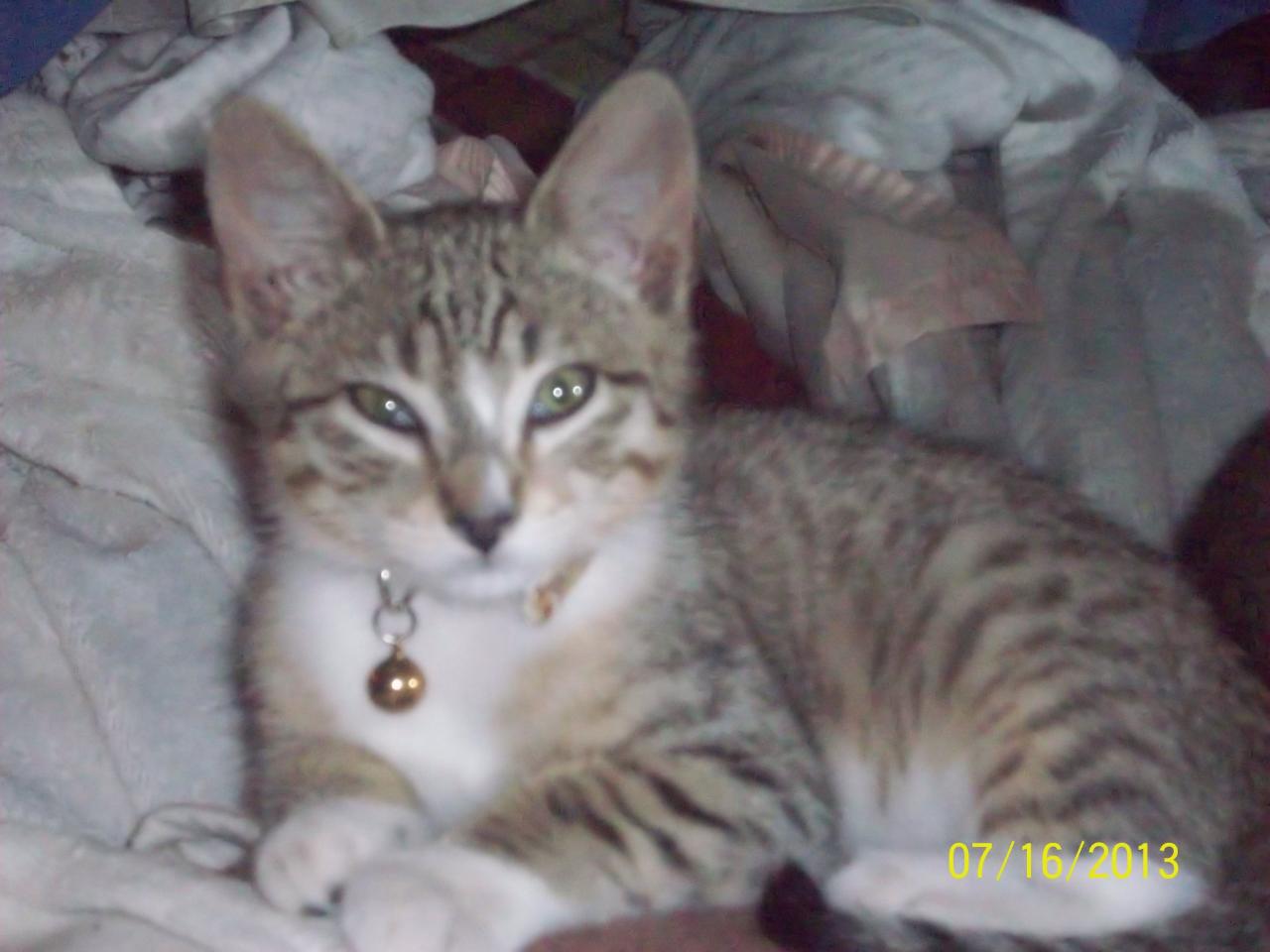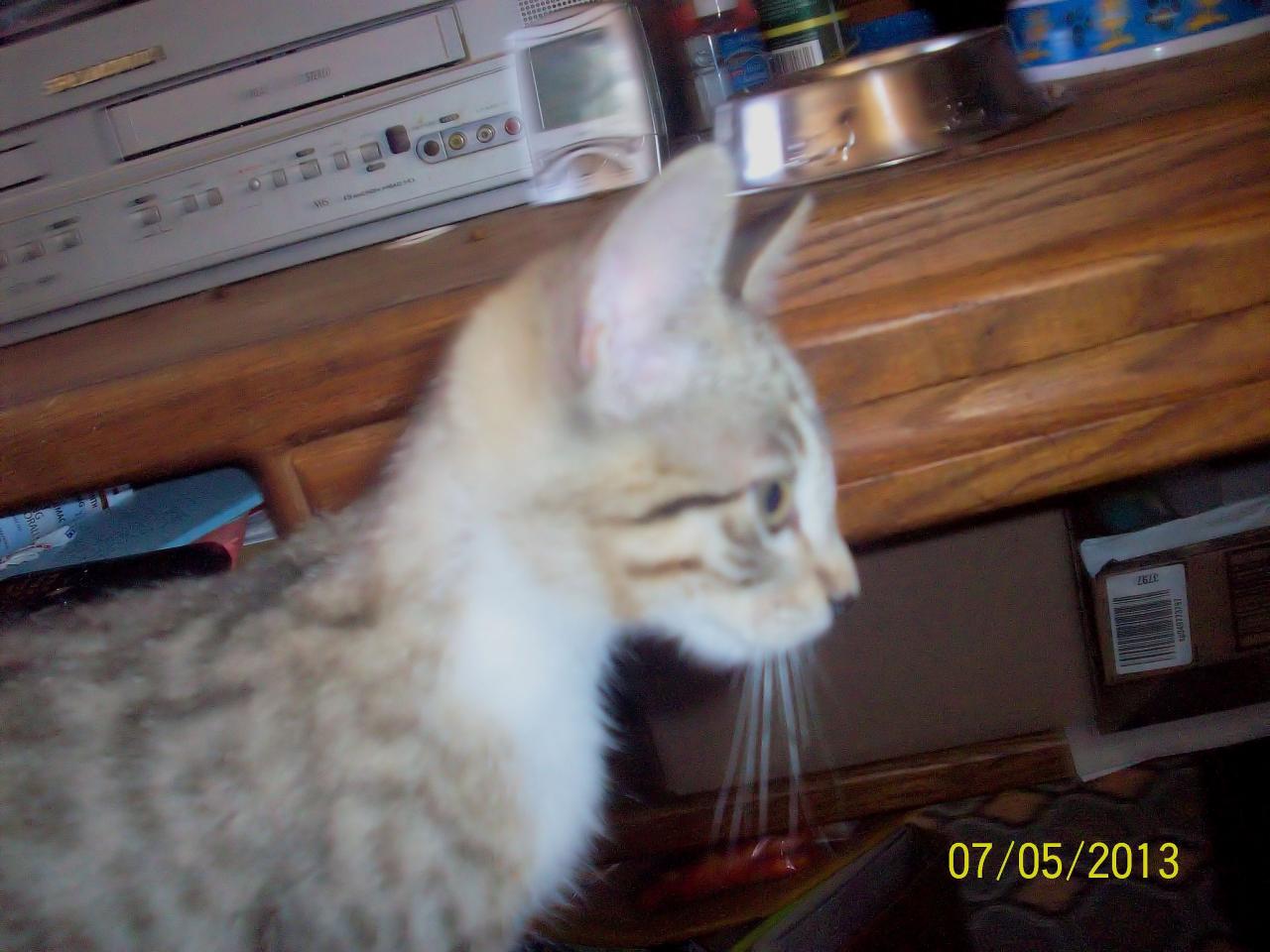 This little guy needed our love, and wants to give love and is quite a stunning little cat, with beautiful markings. very similar to Karl Kat, but different at the same time. This guy came to live with us on July 4th, 2013. My Karl Kat died on June 12th, then two weeks later I lost our Matriarch and oldest cat, almost 19, Aiffa. |