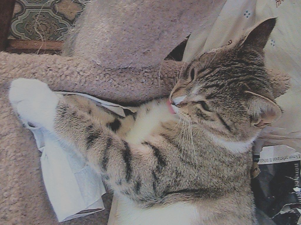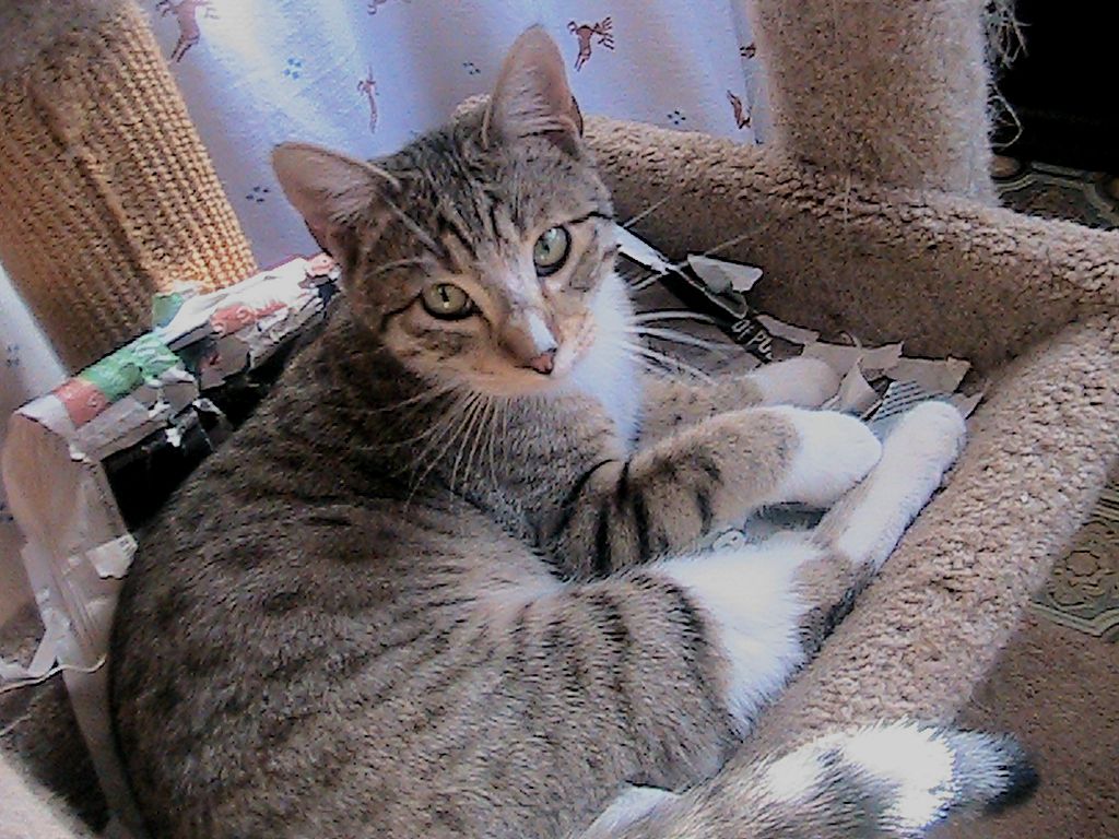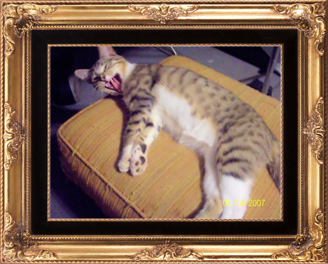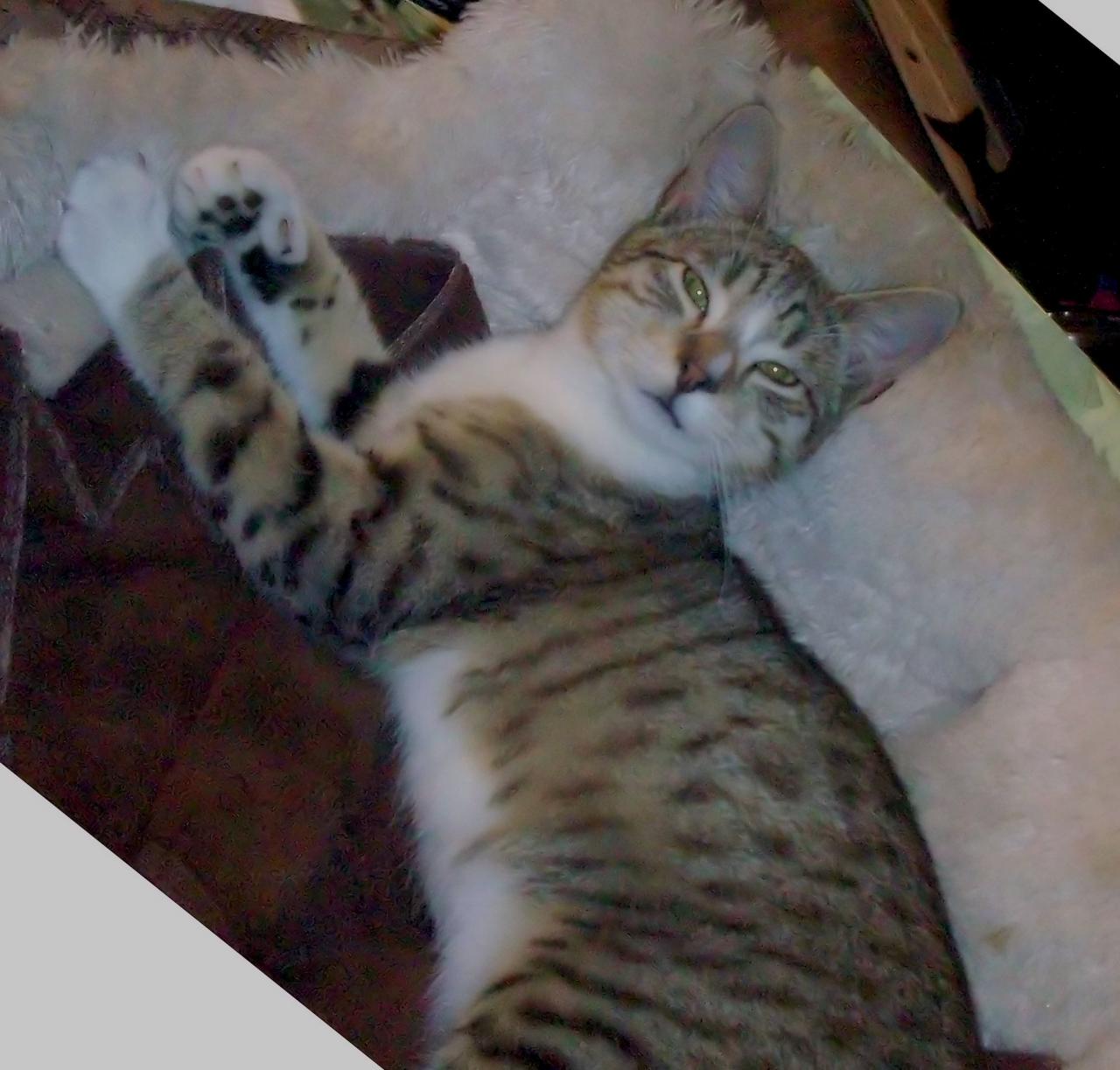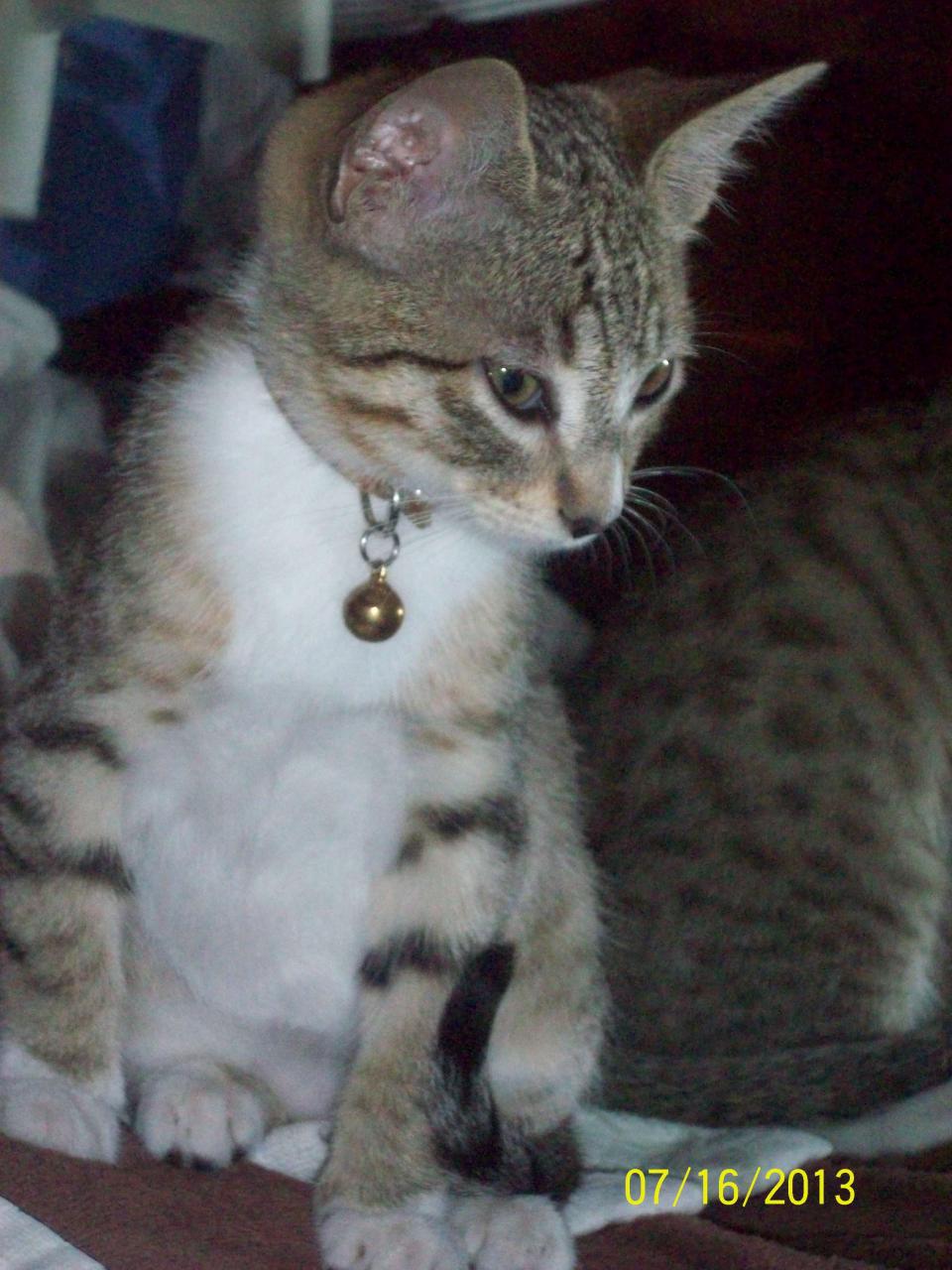 This little guy needed our love, and wants to give love and is quite a stunning little cat, with beautiful markings. very similar to Karl Kat, but different at the same time. This guy came to live with us on July 4th, 2013. My Karl Kat died on June 12th, then two weeks later I lost our Matriarch and oldest cat, almost 19, Aiffa. |