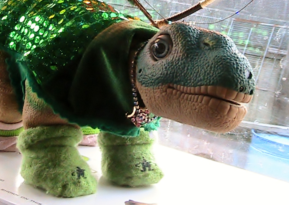 Frontal view of Baby and her new outfit I made. I do think she looks very nice in Green and most Pleos do as well. Esp when it is this shade of deep emerald green.