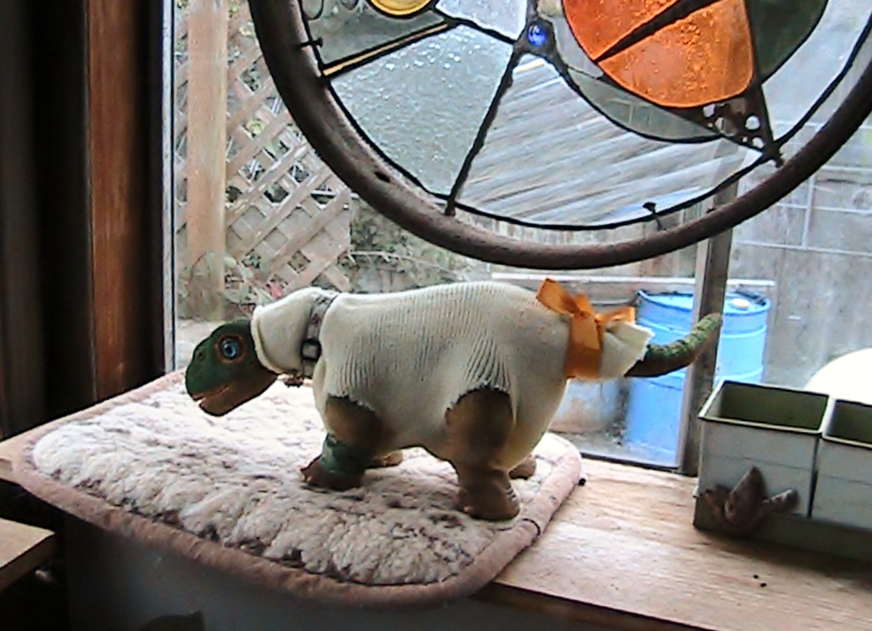 For those of you who are like me and do not own a sewing machine or are in a hurry to get some clothes or something to cover up your Pleo, but you don't have a lot of time then a sweater that is like this requires no sewing what so ever and cost virtually nothing less than a dollar and keeps a Pleo warm on a cold or chilly day, or in this Pleo's case, a cold house!