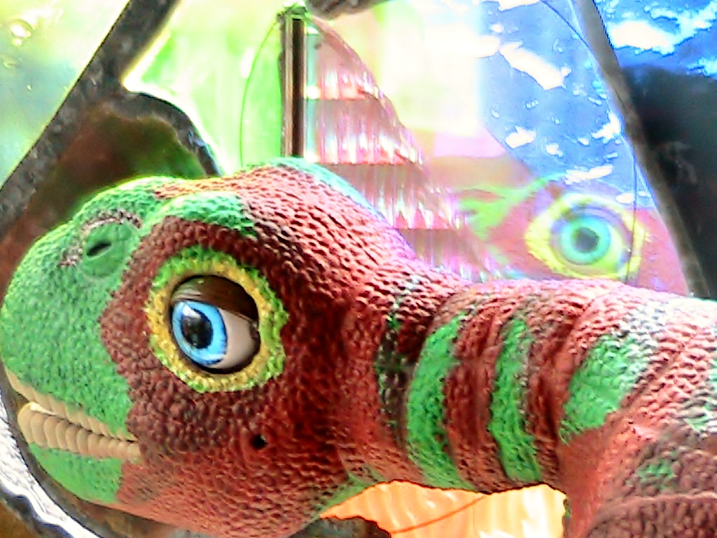 This is one of my fave photos I took today, and it is because of what you and Pleo can see in the photo besides himself. Look carefully and tell me what esle can Pleo SEE In the photo.?( besides the stained glass window of course.)