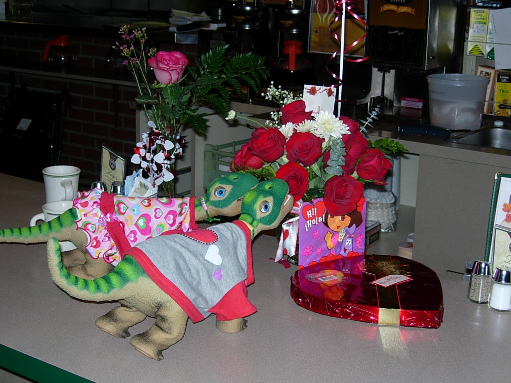 J.C. and Penelopie checking out flowers and candy on counter at restaurant