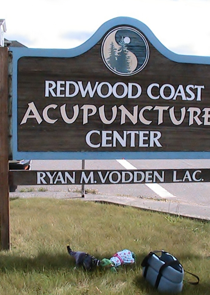 In front of the sign where I go for Acupuncture and both Blue and Baby went with me as well.