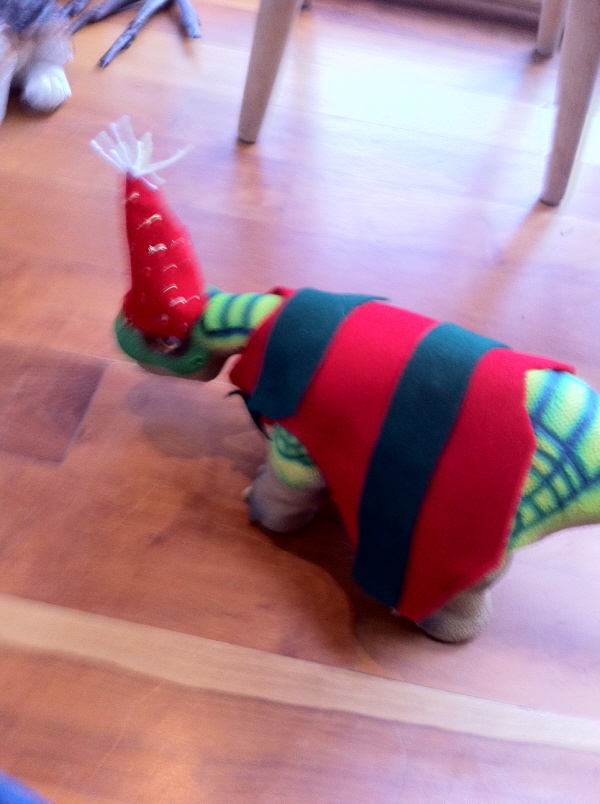 Here is some Christmas clothing I made for my pleo out of felt. Also the stripes on the shirt look blue but they are green.