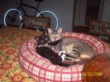 These two were raised together and when my father in law passed away at the age of 93, they came to live at our house. This photo was taken a year ago. They allways slept together. Paco is the little black and white Tuxedo kitten, Suzzette the brown Tabby female.