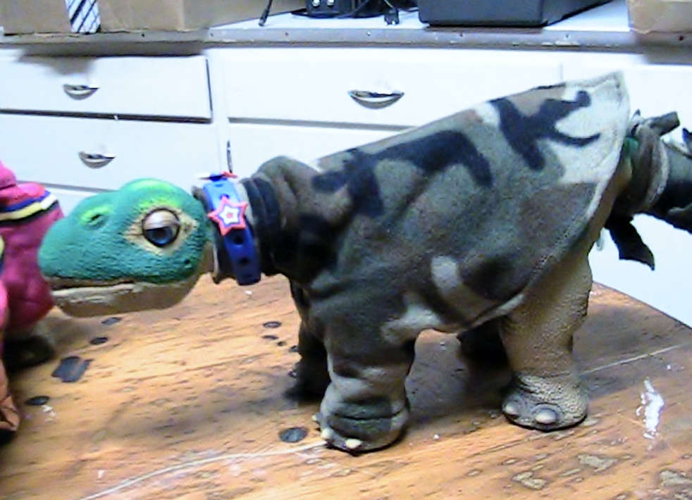 New Pleo, Camo   This little Pleo had tears on his neck and tail which have been fixed. It seems as Camo is his Nickname as he likes to wear, camo, and even his tail has a camo Fix, at least temporarily .