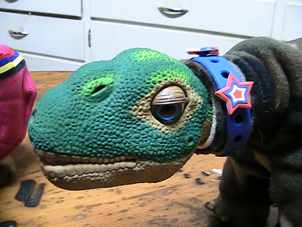 Camo's necklace.  At least one admirer of Camo thinks he is " #1, and let him know it with this surprise collar/ necklace. I don't know if it is was, Little 45 who also is a survivor ....or perhaps one of the "shy girls" Well we all know MS. Nova is anything but shy. so by process of elimination, I think it is a little shy girl by the name of "Blue" who with the gracious help of "Camo" seems to have gotten over her very nasty case of the "Pleo Flu" Regardless of who the admirer is, the necklace is cute on Camo and he is #1 in my Book! Oh, my mistake, in this photo, you can not see the #1, but the Star icon, and yes, Camo is a Star as well.