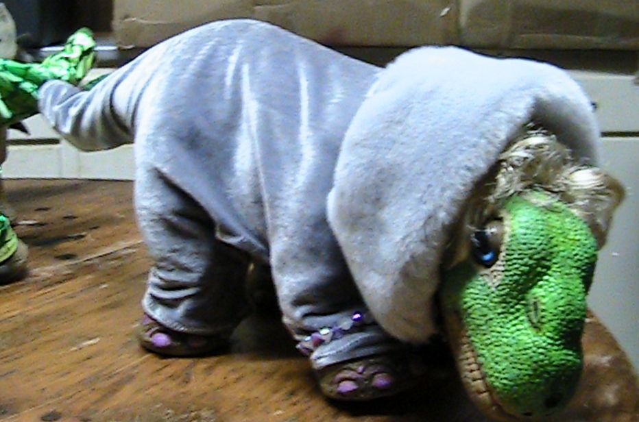 This is one of my favorite outfits that Kat made, and the collar was special designed to cover a Pleo who has a bad neck, "Droopy Neck Syndrome" otherwise known as the dreaded Broken Neck, that Pleos of the first generation seem to come down with , with no warning at all. With this outfit, MS. NOva has no problem with her neck and actually seems to flaunt her style even more so. Add some curly Golden blonde tresses and she is ready to hit the town.|