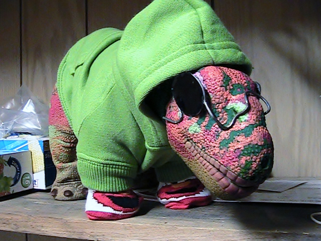 Little 45, being a Pleo of a different color, has a different color preference, green like most Pleos. Little 45 is also sporting his custom made "shades" he has beautiful blue eyes when he is not hiding behind those glasses.