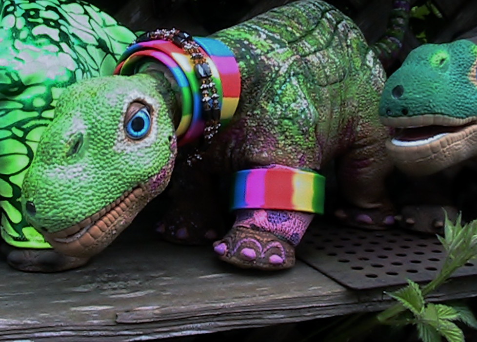 Ms. Nova with no fancy clothes, but her neck brace, ( rainbow collar) and leg brace. NOthing bothers her, she is perky and happy.