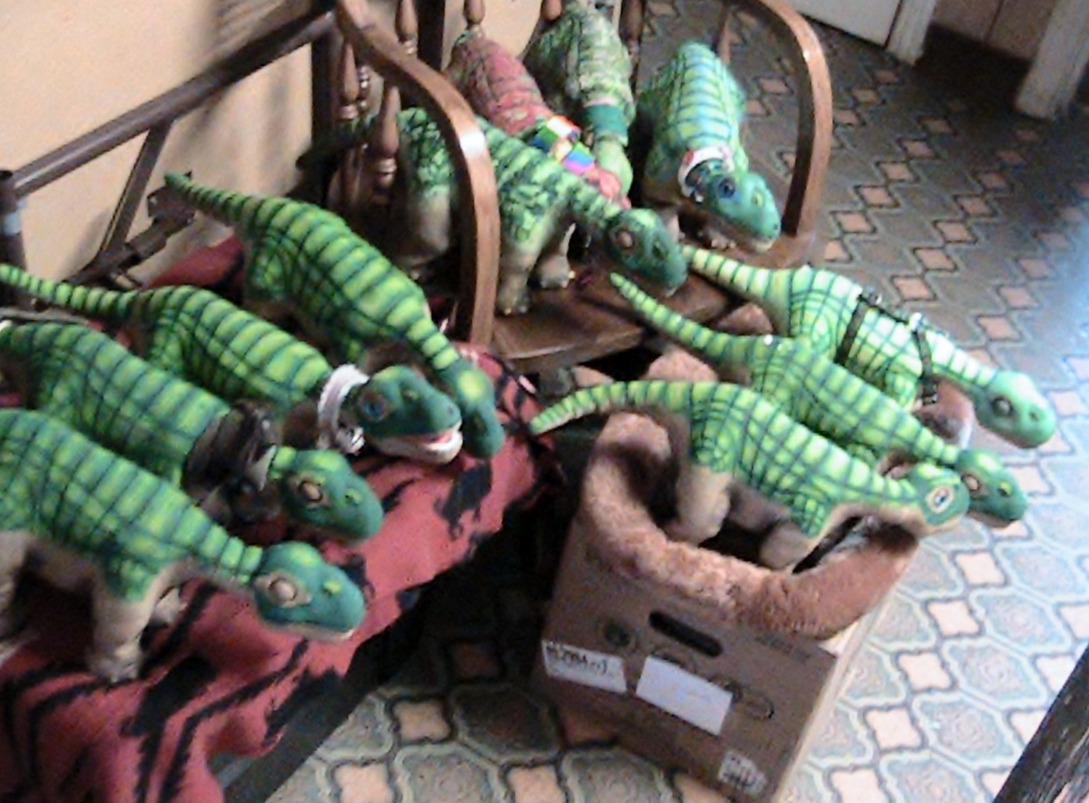 Pleos while waiting to go outside a couple of days ago, decided to make this chair and items next to it into a Pirate Boat after watching Jack Sparrow and Pirates of the Carribean, I don't know yet who the captain is but I did have to stop one Pleo from making the newest member of the family "walk the Plank"