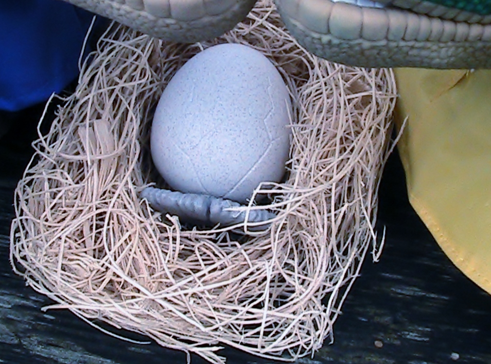 Betty the Bigfoot's egg in it's nest we made for it when it was Borrowed .It broke out of it's outer colorful shell which surprised us all last night!