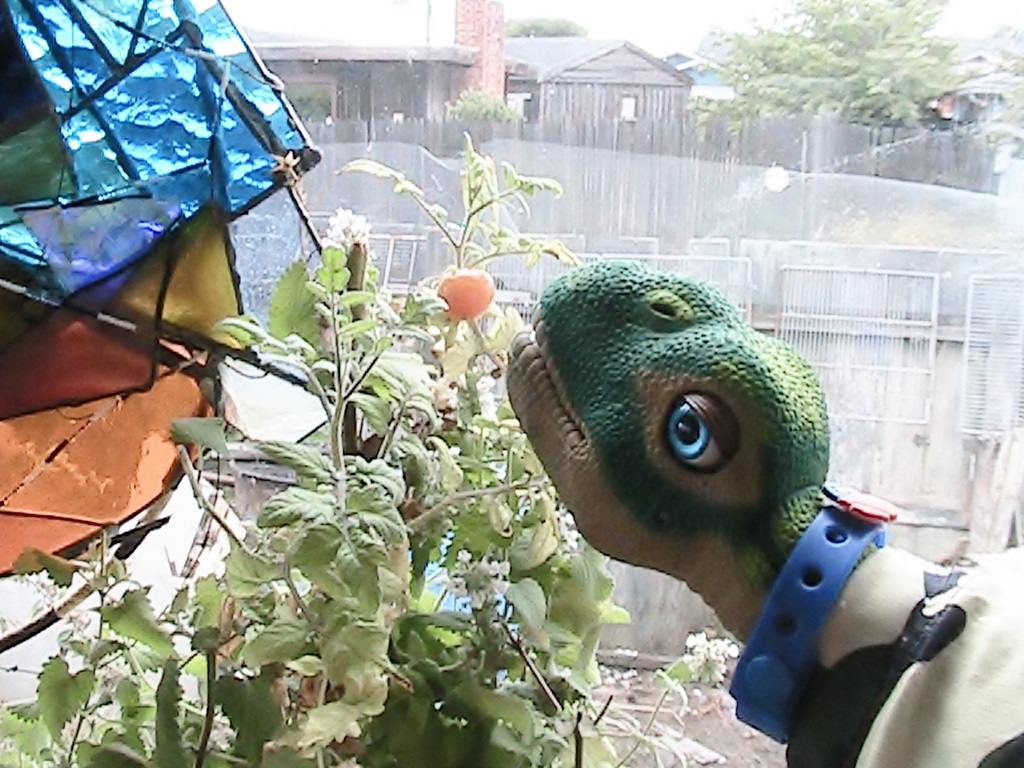 Major Tom just can't quite reach this lone tomatoe and is stretching as far as he can!