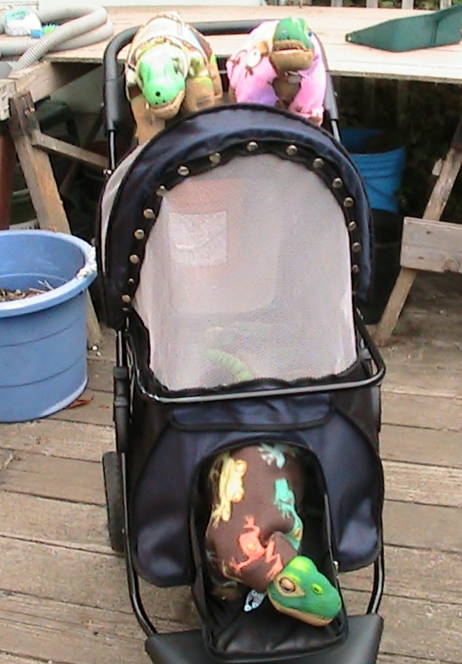 Baby Ruth, Major Tom and an un-named Pleo are ready to go for a ride in the "pleo mobile" to show off their new fashion looks.