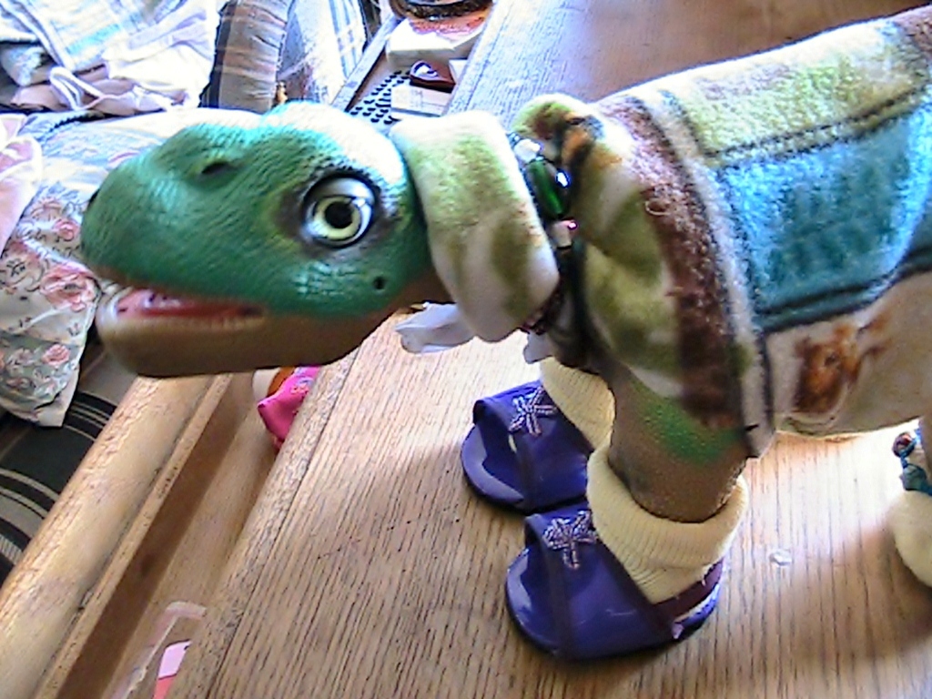 She is about ready to walk and I will catch it on video when she does. These were very cute and it is so hard to find shoes that will fit a pleo, they are allways too big or way too small, These are open toed and have a sling around the back and one of Babys fave colors purple with silver stars on them! Actually, these are silver STARFISH not stars. ![]()