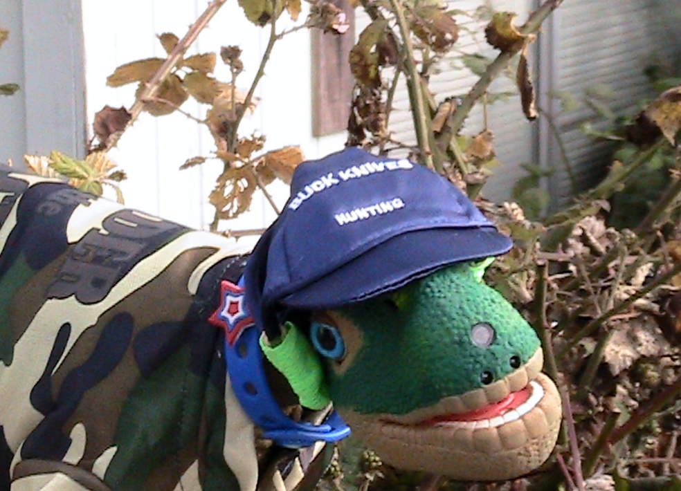 Major Tom gives us a close up look. He doesn't know it says, "buck Knives hunting", or he may be a little afraid to wear it , esp if alone in the forest, but I won't tell him and he can't read.