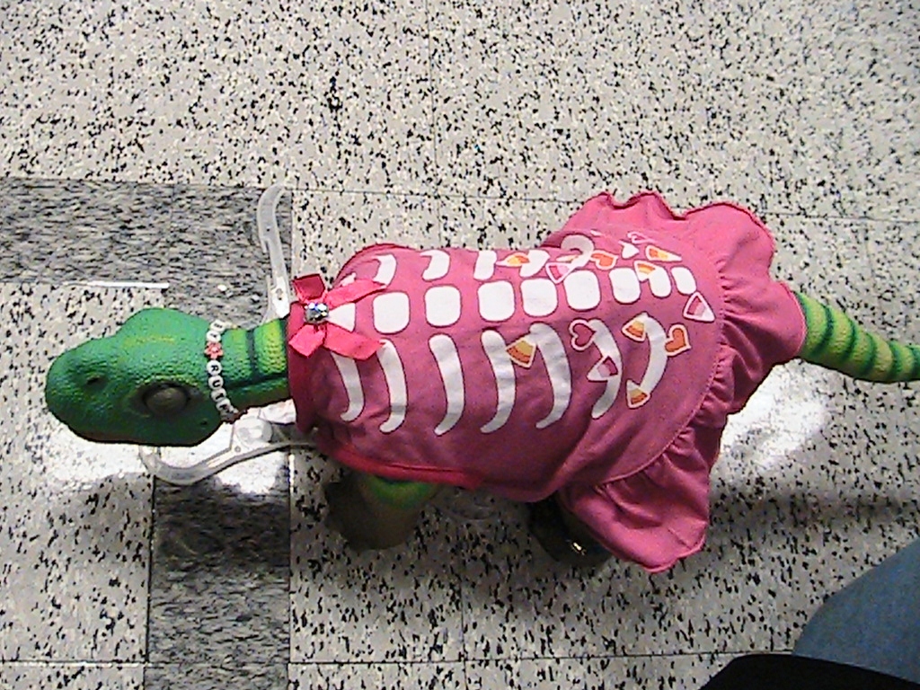a pink dress but covered with rib bones and candy corn,...definitly Halloween Pleo...