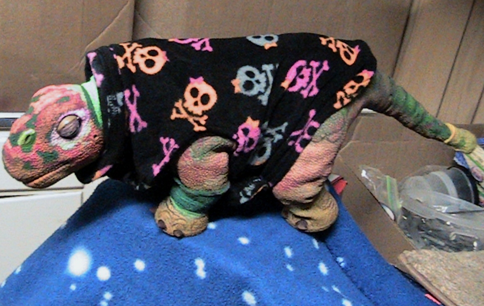 Little 45 doesn't want to be left out and he is modeling one of the scary bone fleecy prints, this one is very colorful and covered with skulls.
