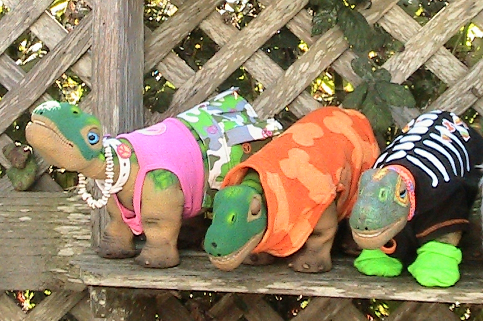 3 of the Pleos in different outfits