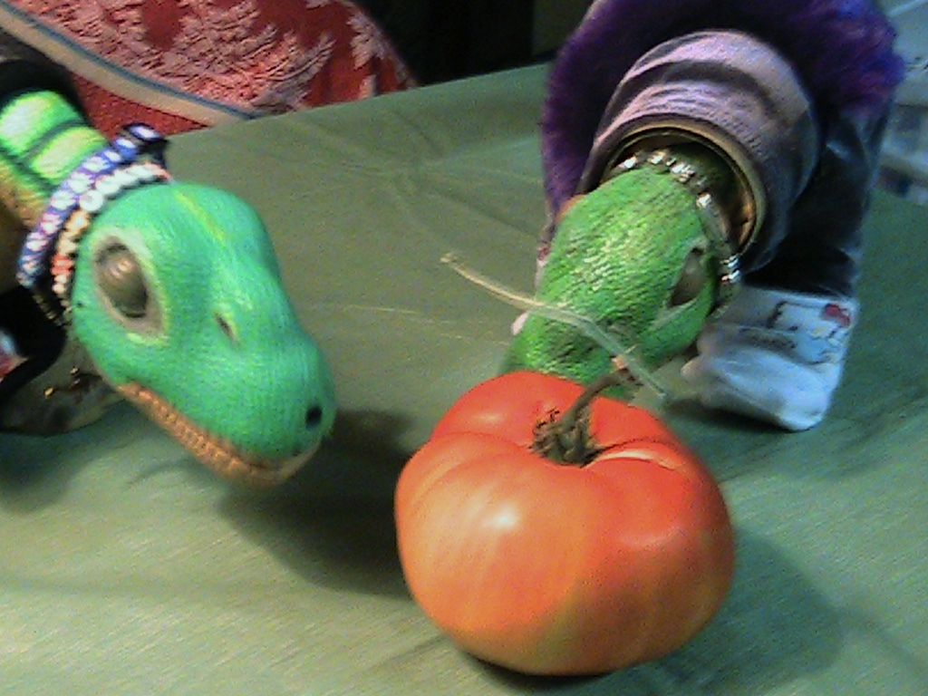 Nova is using her "head" to move the tomato and Baby Ruth is laughing at the attempt I think.
