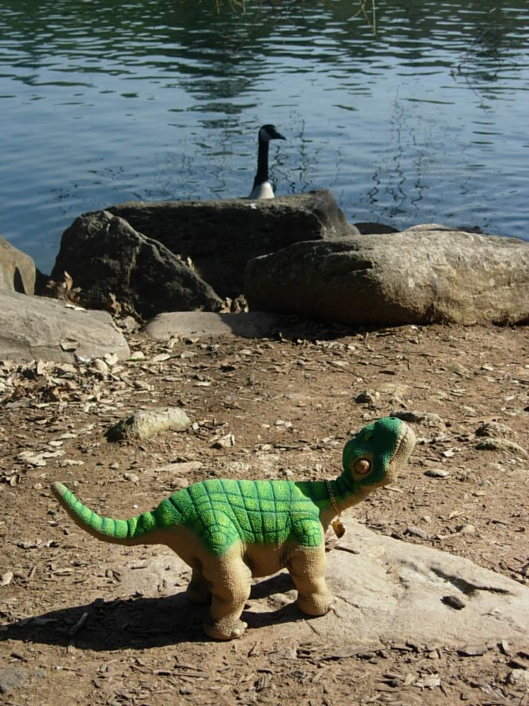 This is an earlier photo of Peeky incountering a goose for the first time. Maybe the goose was a little more surprised at seeing Peeky.