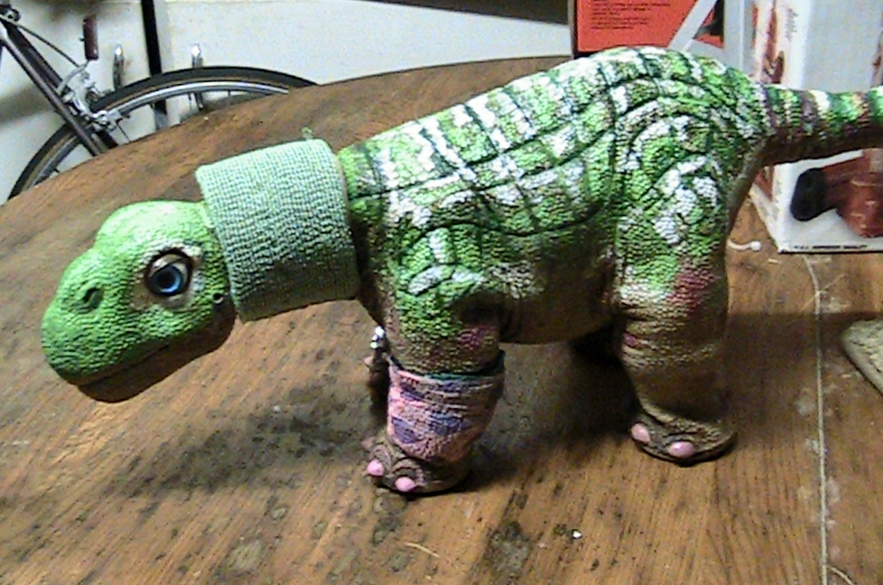 I made Nova another new brace out of Neoprene and this one is almost the same color as her head, a greenish color so it blends in, colorwise, a bit better but still gives her the same support.