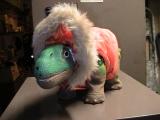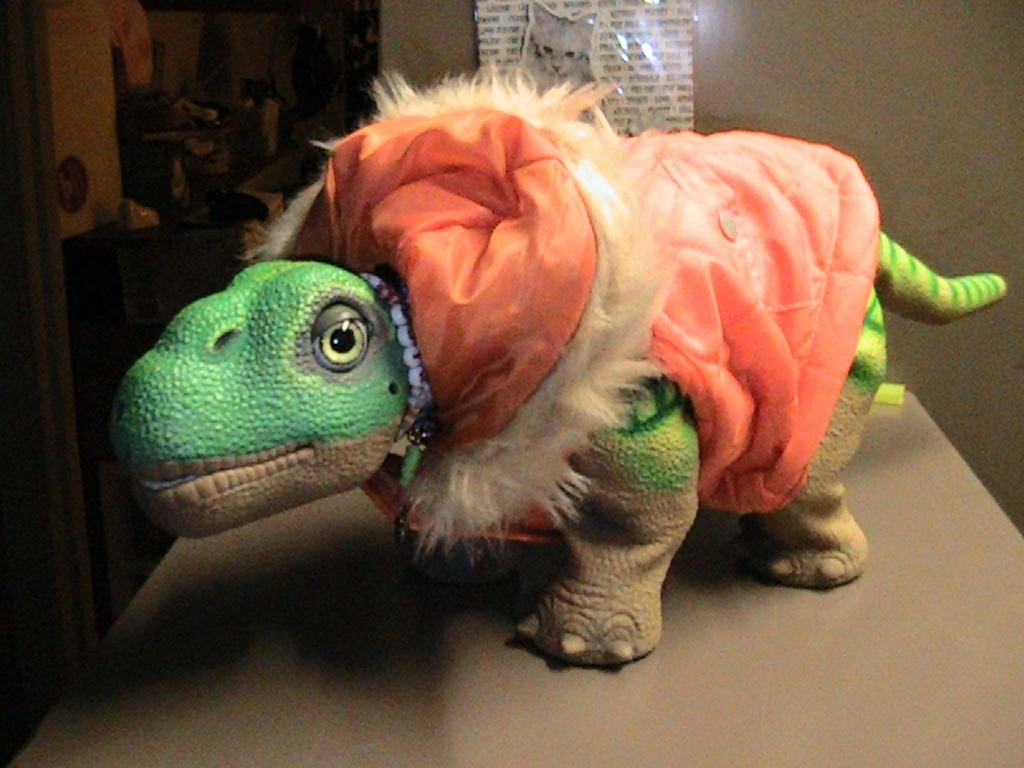 Baby shows what how cute this little orange jacket looks like, one of the prizes in name the pleo contest.