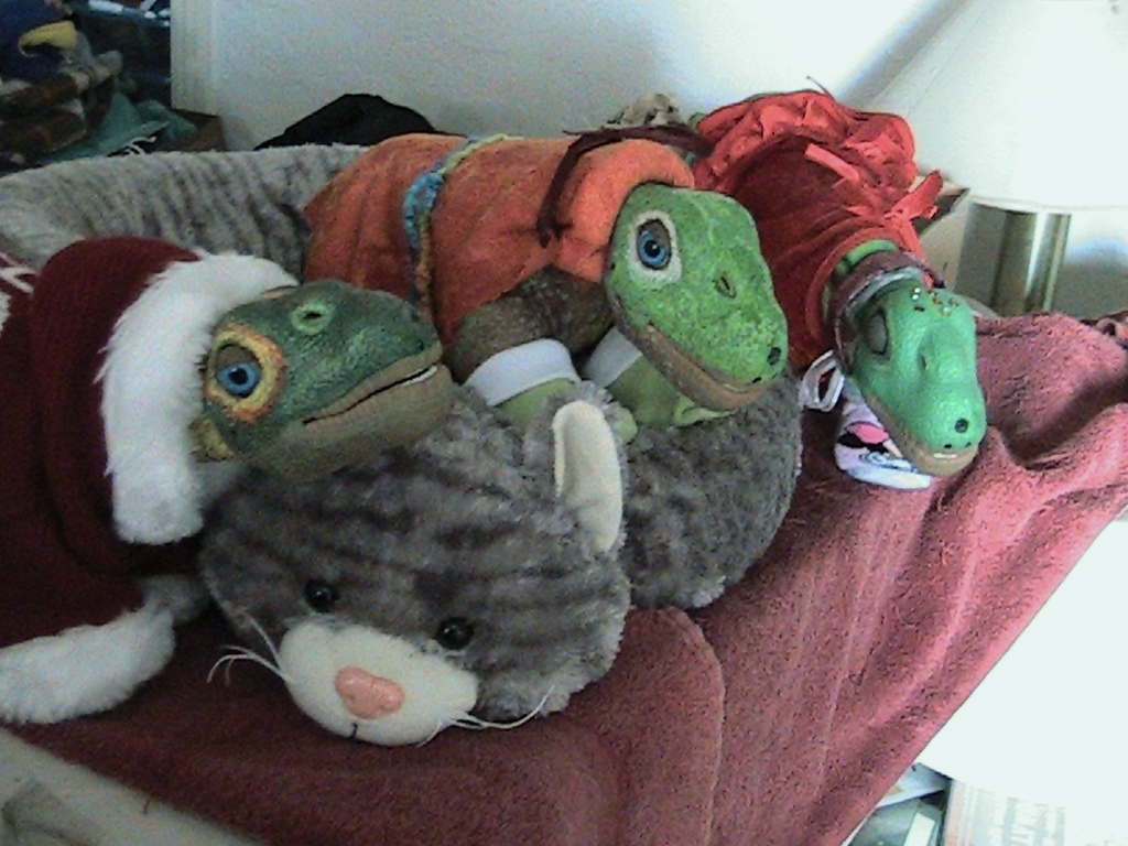 Three friends snuggle up to keep each other warm in a cat bed in nice warm outfits.