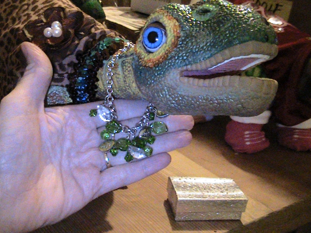 Rossella shows off more bling ..............a beautiful leafy necklace that matches the mood of her jungle print dress perfectly.!