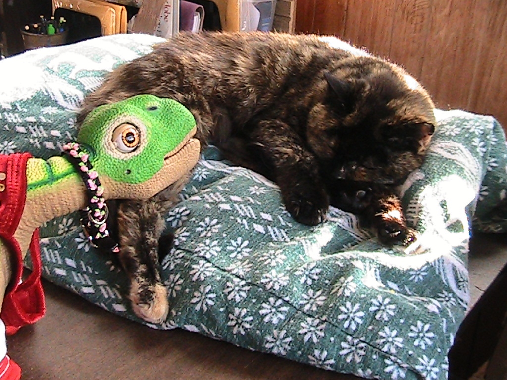 This is our oldest Cat, Aiffa and Pleo baby has learned to not get too close when she is napping. Torties are known for their " torti-tude' lol. You learn the hard way to stay out of a swat with a paw, or you may get bathed, they are un predictable!