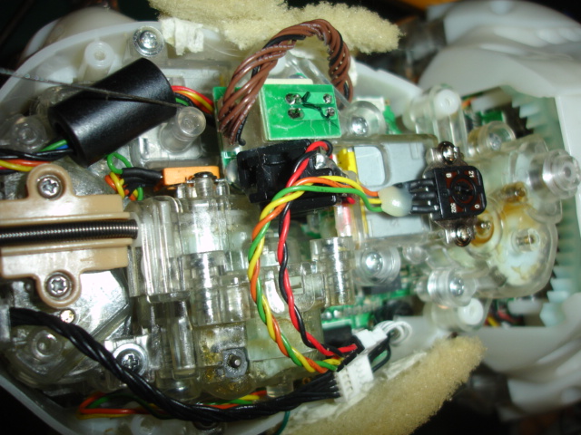 - Underneath the backplate, the green circuitry in the upper section must be lifted up to access the gear housing. There is a screw located just under that piece. Do not pull it out from the body, just lift it up.