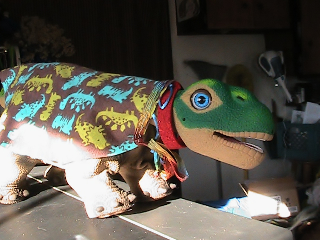 This special little Pleo is going to a new forever home and in honor of that, made him something special to wear, his very own Dino Cape. Cute just like him!