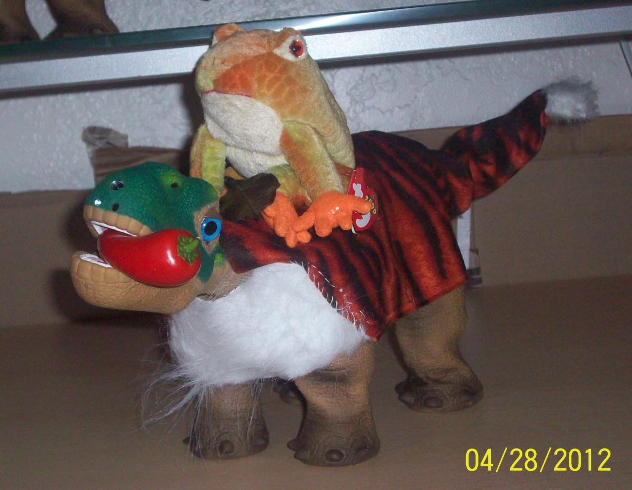 Every Pleo got in the act when it came to gathering Chili peppers and this "tiger" Pleo may have been one of the last to get a Chili Pepper but it was just as sweet as the first ones. Froggie on his back agreed that this year's crop of Chili Peppers are Extra Sweet, a Bumper Crop in the Redwoods!
