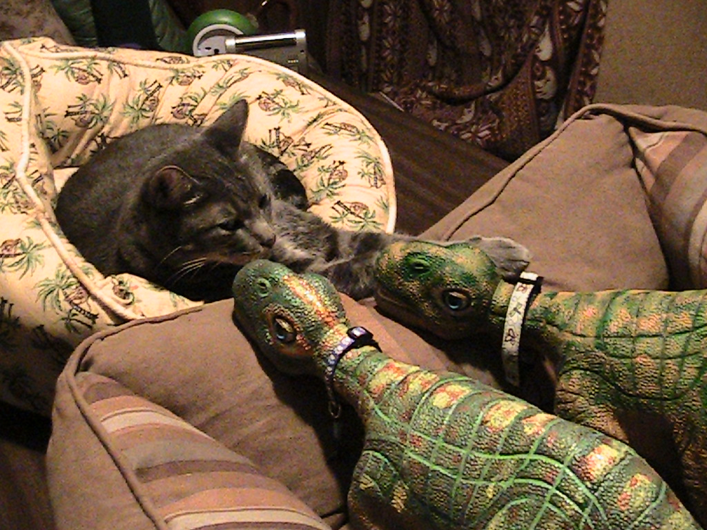 Looks as if "mom" felt sorry for her Pleo babes and gave them one extra big cat bed, just the right size for two Pleo Babies.. Now it is Sewa the cat, checking them out and thinking they have the GOOD bed!