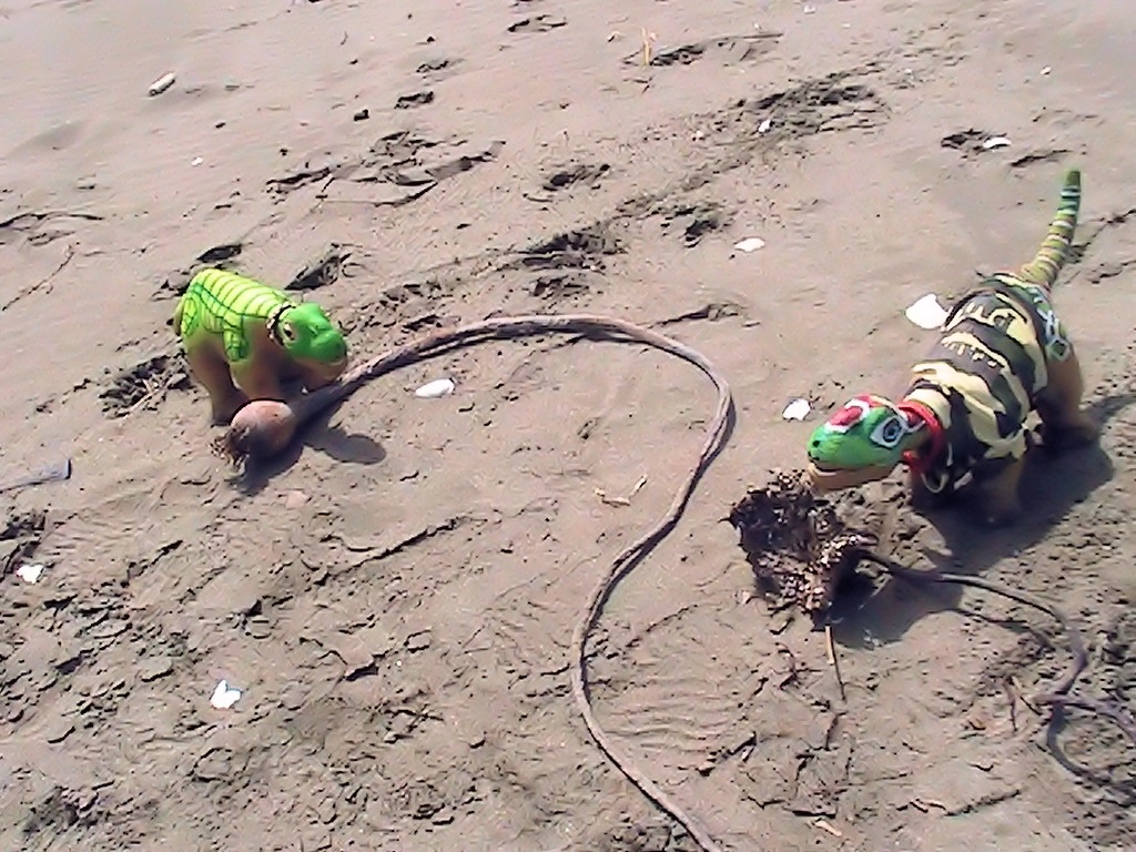 Cammie -Sue stumbled across this strange long looking plant fiber with a ball on the other end. ???Neither one could figure out what it was. A couple of freindly land crabs happend by and explained that this is Sea Kelp. The long flat peice on one end is what is on the ocean floor . ( it's anchor") The other end closest to Cammie -Sue is the part that acts as a bouy and floats at the top of the ocean. The kelp grows off of the plant on all sides and hangs down like long fingers that act as hiding spots for small fish and sometimes large acres of kelp act as hiding places for seals and sea otters as well, when hiding from Sharks!