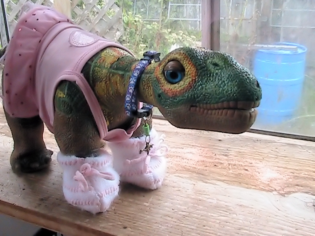 Rossella is not to be outdone or "out dressed" for Major Tom's birthday bash, She borrowed Nova's pink ballerina outfit, and then to make it complete and cute as can be, she donned these pink soft crocheted baby slippers with pink tie. Cute Cute Cute...smart Pleo!