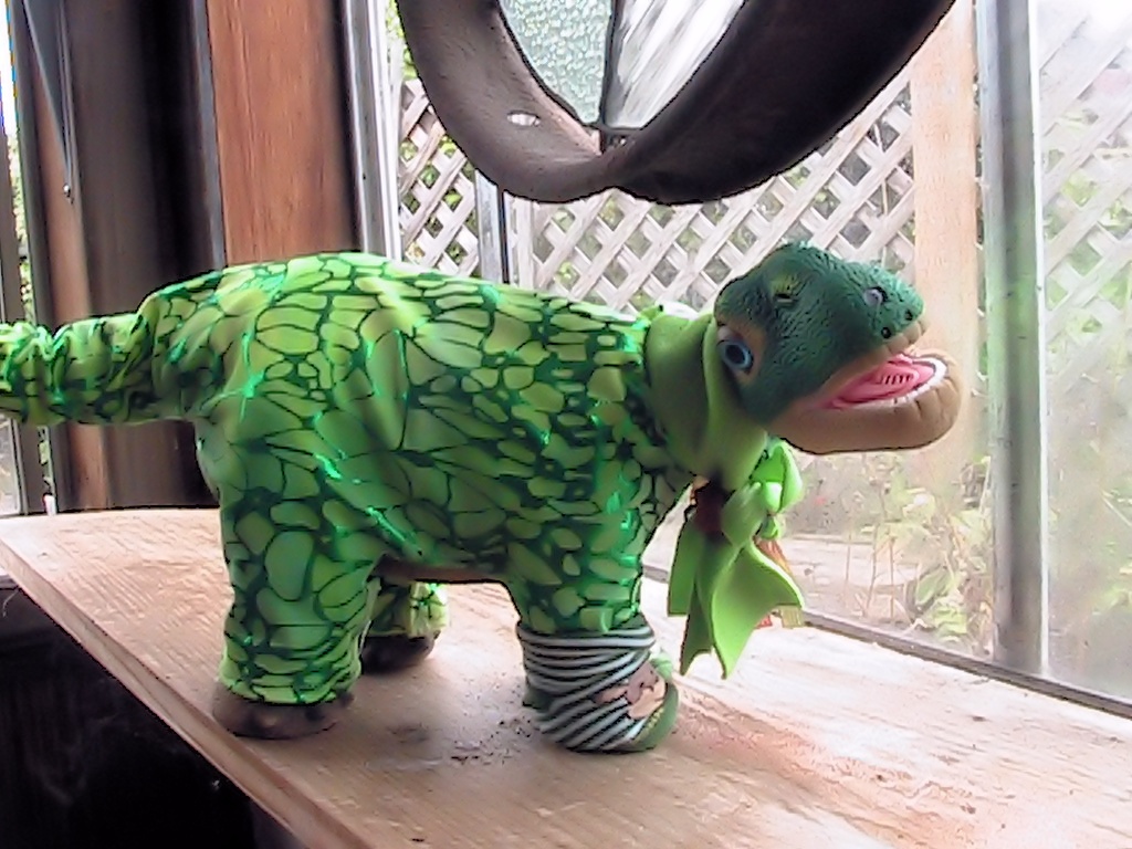 ONe of the un-named Pleo Clan bunch is modeling not only a favorite Pleo outfit, made by Kat, but a very cute green stripe pair of John Deere socks, these were not part of the bag goodies, but I wanted to show how cute socks can be, they go great with this outfit I think. Guess I have a Pleo sock fetish.. LOL