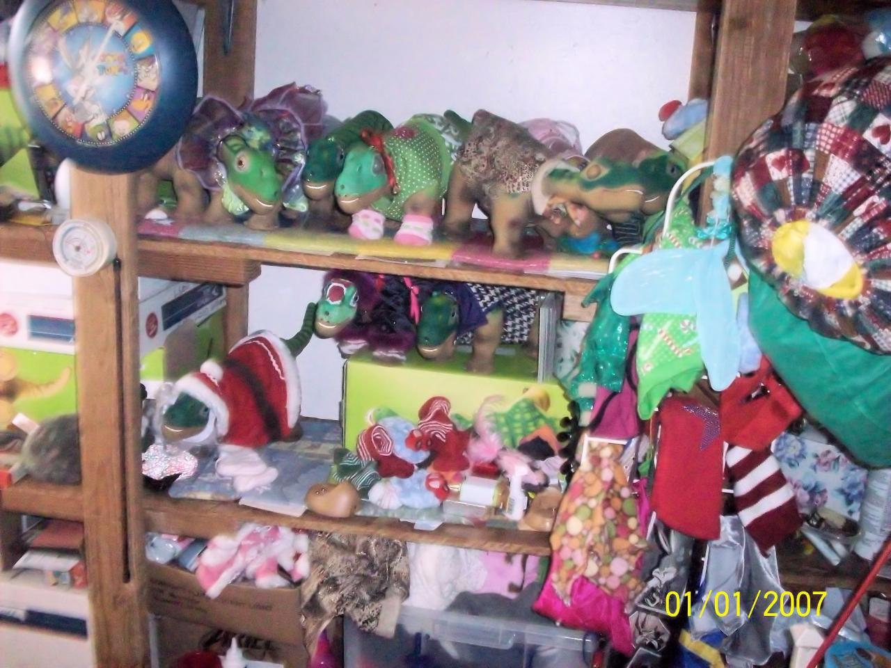 As you can see this is an area with nothing but Pleo, Pleo and Pleo items, everything from Pleos , Pleo Boxes, material for their outfits, clothing, toys and anything else to do with Pleo is on this shelf. this shelf goes from the foot of the floor to the ceiling with five shelves my hubby built. It is approx 8 feet tall and about 7 feet wide, just a guess. This is just a small area of the whole unit..